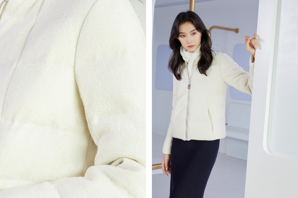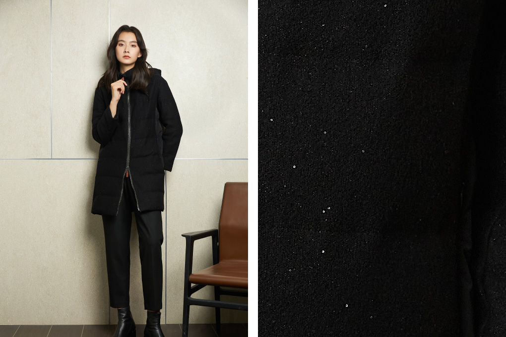 材质上选用了羊毛材质的面料,在纱线的交织中加入了小亮片,让整体呈现低调的高级感。