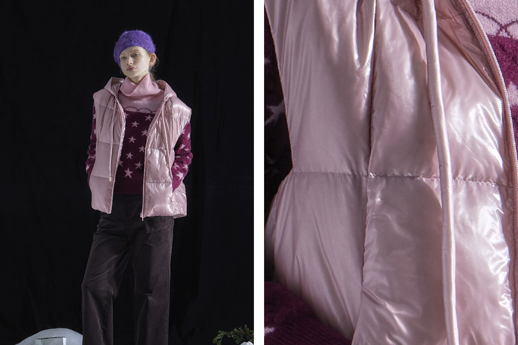 连帽马甲羽绒外套采用双层提条组织的聚酯纤维面料,布面饱满,经特殊后整理,使面料富有肌理变化,面料视觉效果丰富。木兰花粉色款面料油面压光颜色透亮,10D超轻尼龙面料,密度为420T,克重轻,穿着舒服无压力感。