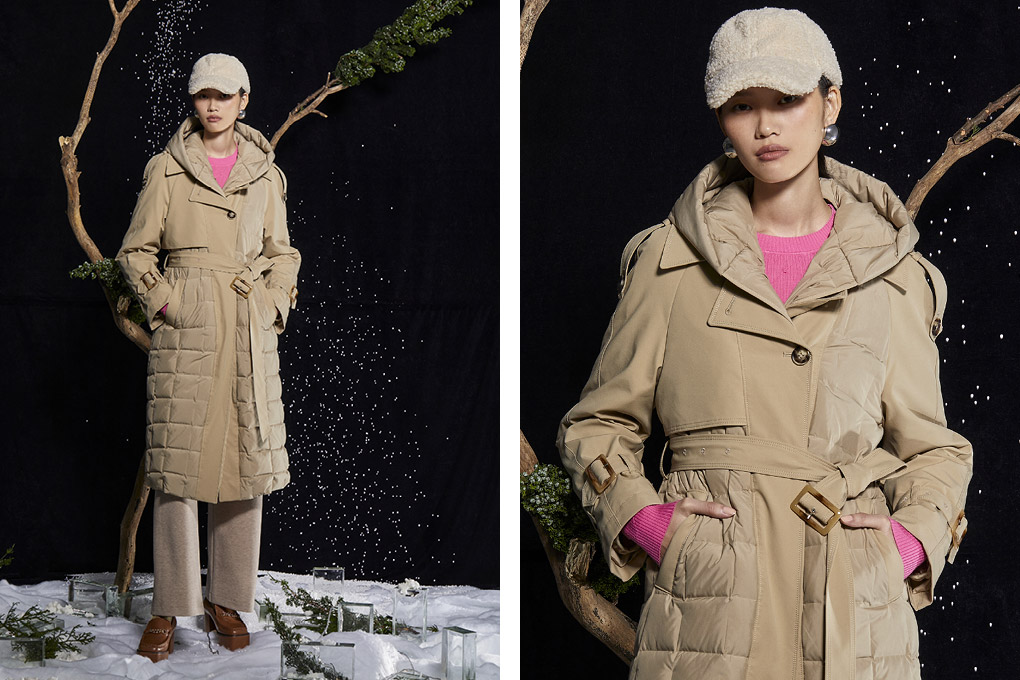 将羽绒时装化,风衣式廓形加上可拆卸的连帽,年轻之余亦有功能性。剪裁流畅俐落,腰带更是点睛之笔,改善比例的同时也为穿搭塑造无限可能性。