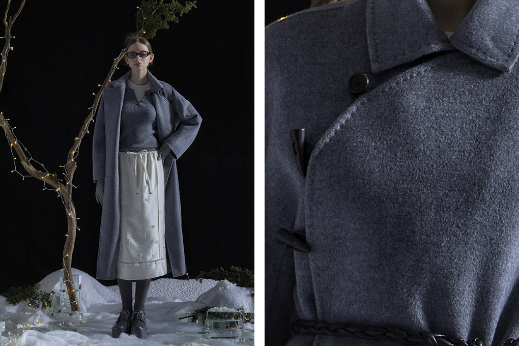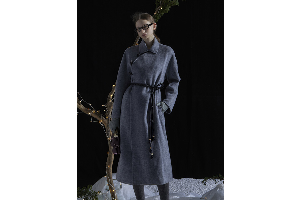中式斜门襟双面呢大衣采用顶级羊绒与优质澳洲羊毛织造而成的双面呢,兼具了羊绒的细腻柔软及羊毛的挺阔骨感,短顺毛的面感顺滑有层次、质地紧密。整件大衣采用珠针绣工艺,由特种机器缝制,间距均匀,精致有型。