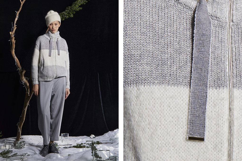 高领针织开襟羽绒外套,外层针织面料以高比例羊绒混纺珠片纱织造,质感柔软。 MINI珠片隐现于织物当中,散发出浪漫的金属光泽。内层则是轻羽绒,解决了冬天粗针针织容易灌风的困扰。