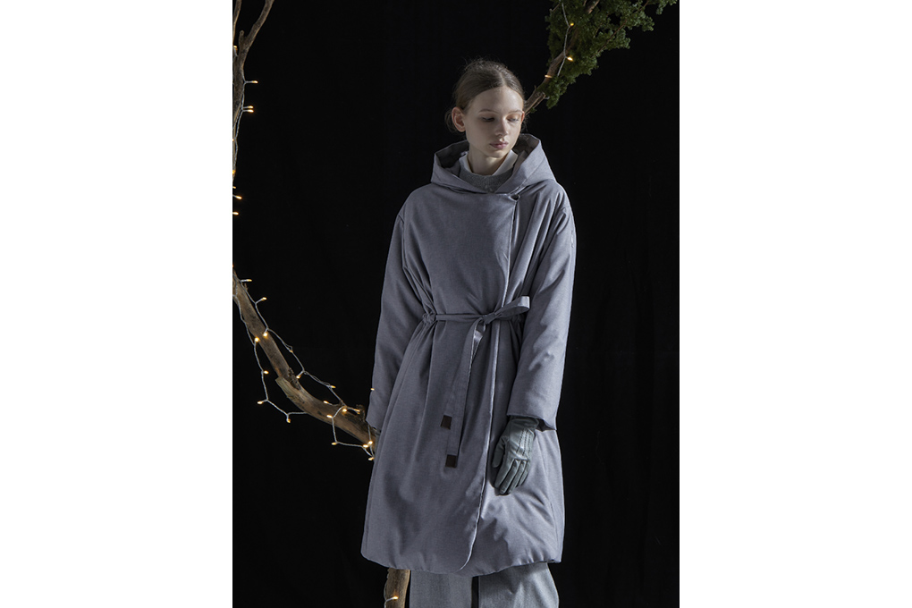 大衣廓形羽绒外套采用两种不同的涤纶线编织,经过独特的染色和后处理工艺,使布面呈现色织花色视觉效果;再经压光工艺增强了光泽感。将羽绒时装化,剪裁流畅俐落,腰带更是点睛之笔。